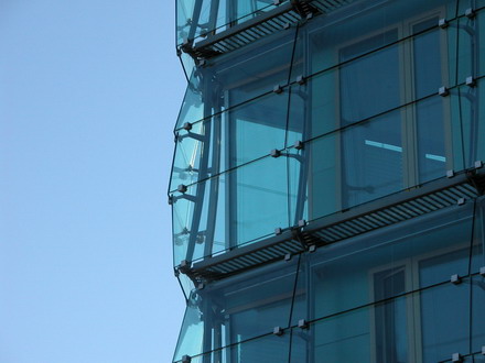 Lennéstrasse 1 Ansicht Doppelfassade Eckbereich Die Tragkonstruktion der Doppelfassade nimmt die Krümmung der Fassade in ihren organischen Formen auf.