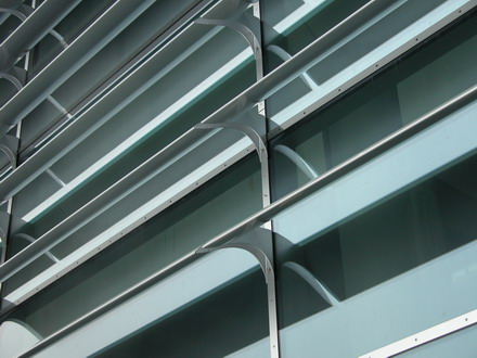 Mercedes-Benz Center Ansicht: Feststehende Sonnenschutz - Lamellen vor Festverglasung