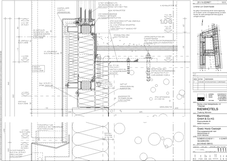 Riem Hotels, München Leitdetail: V-Schnitt Elementfassade, waagerechtes Blechband über EG